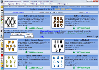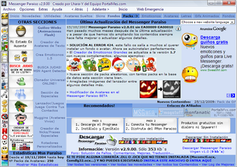Los extras que incluye son muchos, incluyendo avatares, emoticonos, fondos, GIF animados, letras, skins, guiños, fondos de interfaz general, etc., todos ellos tanto en forma de paquetes como de manera individual. Otra característica de Messenger Paraiso es que incluye utilidades adicionales como un detector de contactos que te bloquean, un lanzador de juegos y aplicaciones, visualizador de carpeta de almacenamiento de imágenes, creador de emoticonos personalizados, etc. Esta inmensa colección de elementos se va ampliando poco a poco con el tiempo, por lo que cada vez nos encontraremos con mejores y más cosas para instalar.